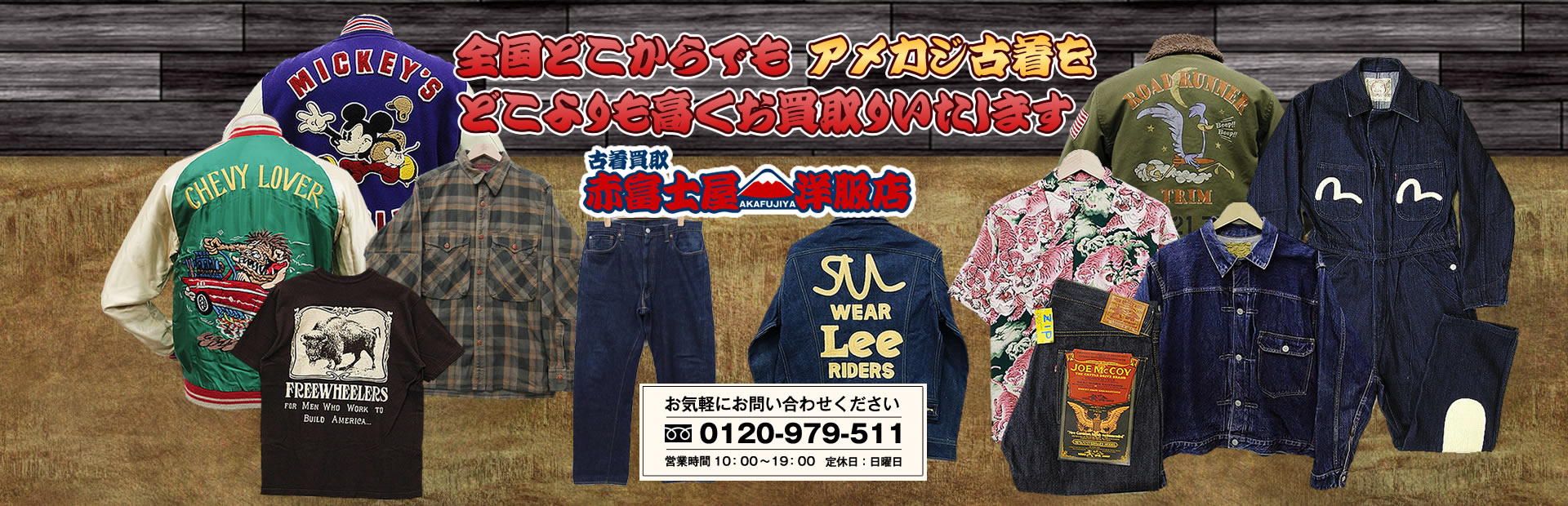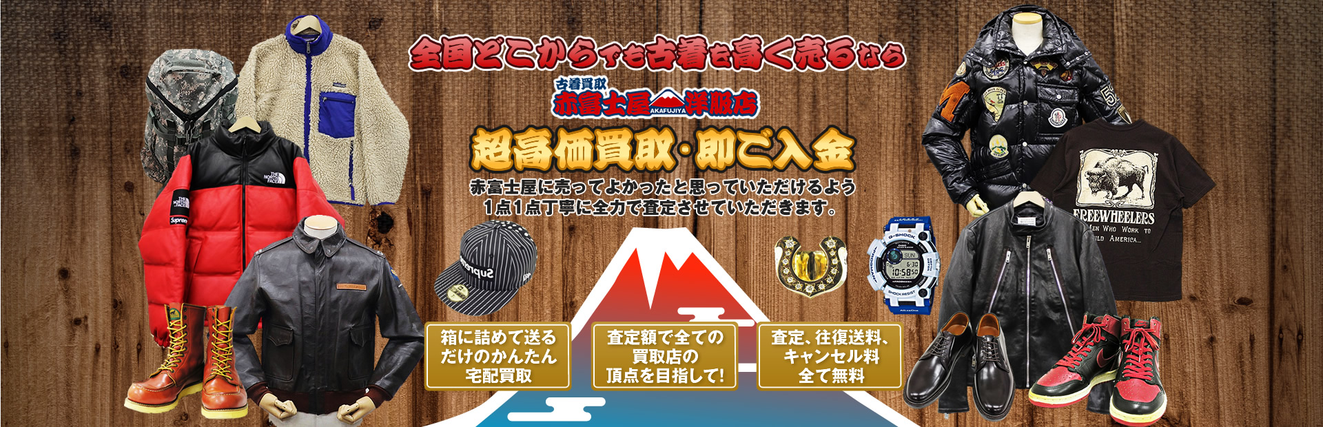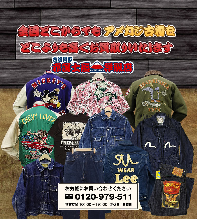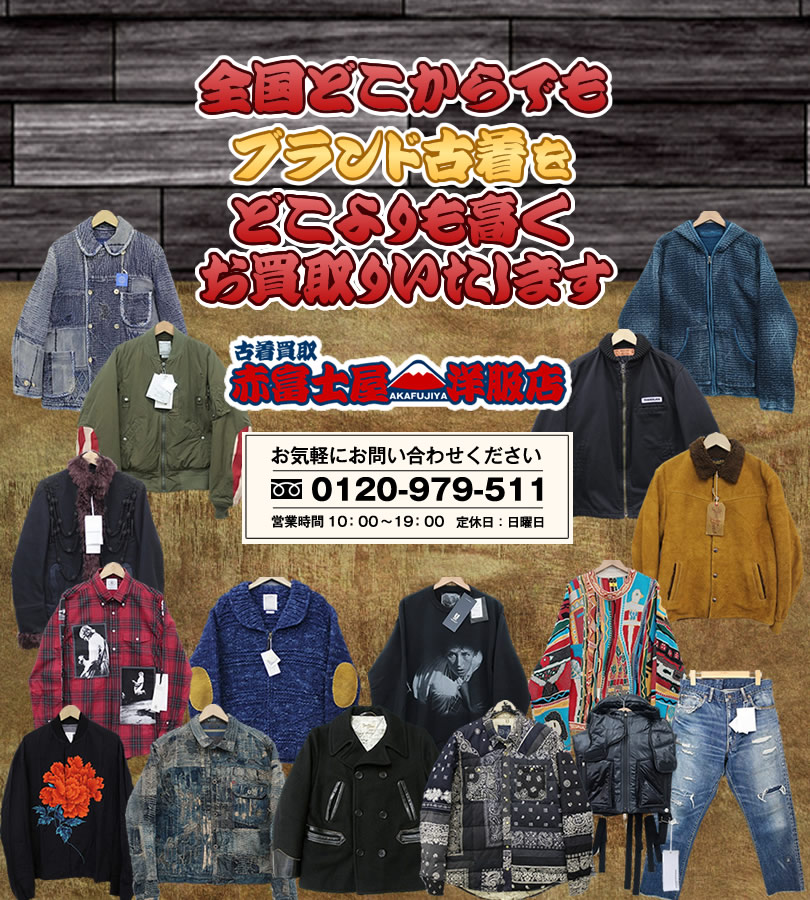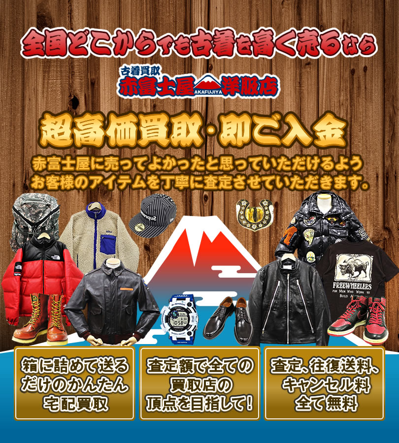 当店は古着買取専門店の「赤富士屋洋服店」です。アメカジ、ブランド古着を全国どこからでもご発送・ご返送・査定を無料にて、ご自宅から一歩も出られる事なく古着の高価買取をさせていただきます。 安心してご納得・ご満足を頂けます古着の超高価買取をお約束いたします!