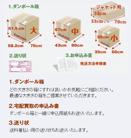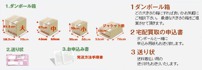 無料宅配キット(送り状、ダンボール、申込書、買取手順書)をお送りいたします。